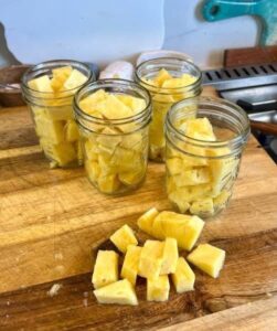 - Fill the jars with pineapple pieces, leaving a small space at the top.