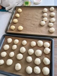 4. Shape the balls: Once the dough has risen, punch it down gently to remove excess air. Divide it into small pieces, about the size of a golf ball. Roll each piece into a smooth ball using your hands.
