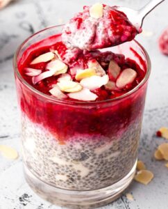 Raspberry chia pudding provides a good amount of nutrients along with some protein.